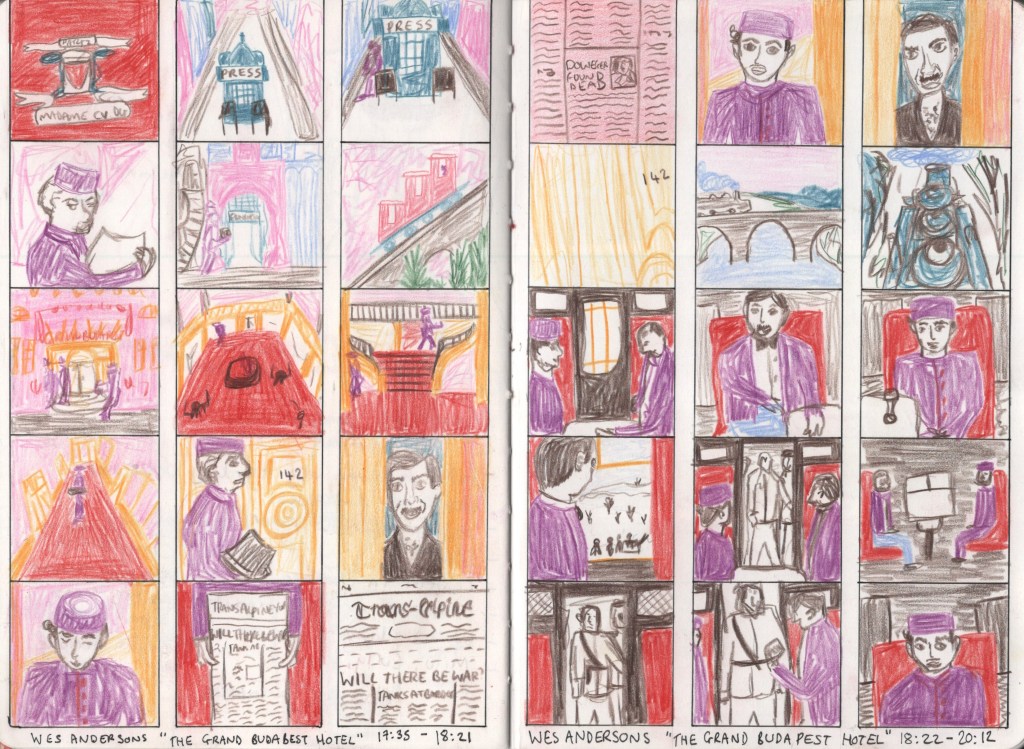 I was careful when choosing my medium for this – the exercise specifies to draw clear singular lines and blocks of colour, and to focus less on detail, only drawing what is needed to express the scene. As Anderson’s colour palettes are so intrinsic to his films, I knew I had to use colour, so opted for Faber Castel Polychromos coloured pencils. I consciously limited my palette to encourage me to be selective in what I drew. This ended up being a really good choice, and I think the outcome is fantastic.