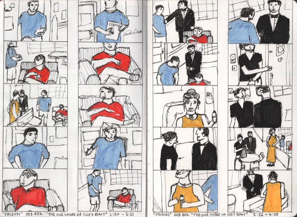 To repeat the exercise I chose another favourite media of mine – the TV show Friends. One of my favourite episodes is Season 3 Episode 2, The One Where No One’s Ready. My reasoning for this is that it’s staged in real-time – a real 20-minute long interaction filmed over one take. It’s a beautiful piece of comedy and hugely relatable to most people. Considering the aim of the exercise, I knew I had to study it in more detail, examining how the scenes progress despite being real-time. Once again I watched the episode through, picked a scene I wanted to draw, watched that a handful of times, and then felt ready to start.