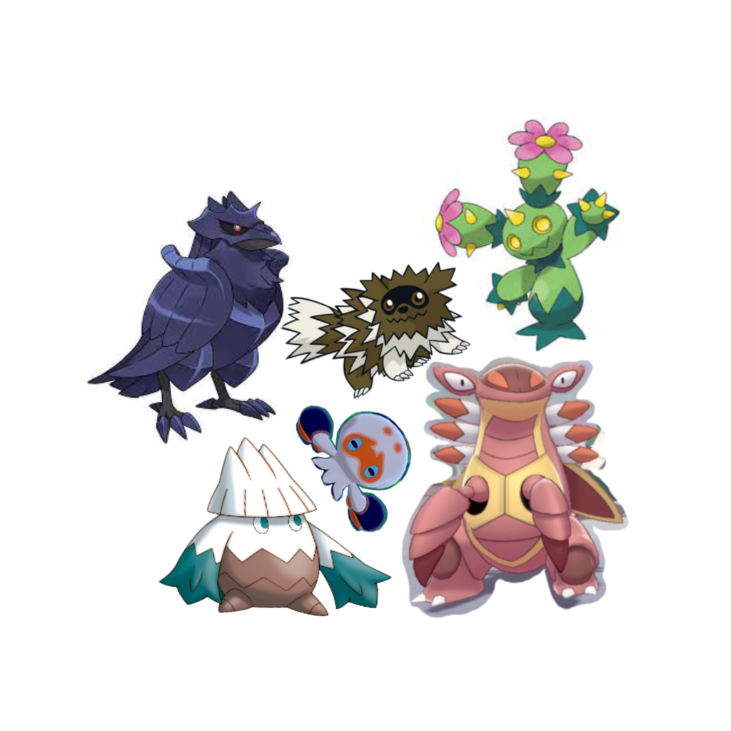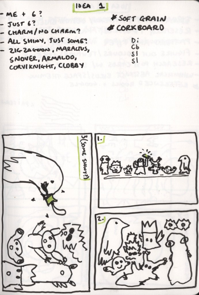 Reviewing my previous work made me feel nostalgic and excited, as my growth is so noticeable. I was looking forward to seeing how my work for this assignment would compare. I got back to my sketchbook and started planning out my postcards. I drew some boxes to thumbnail my ideas in and wrote some notes alongside. I started with the Pokémon postcard concept, as I felt it would be easiest to nail down. I began by choosing 6 of my favourite Pokémon – the size of a team in the game. I then started playing around with composition, content, and layout.