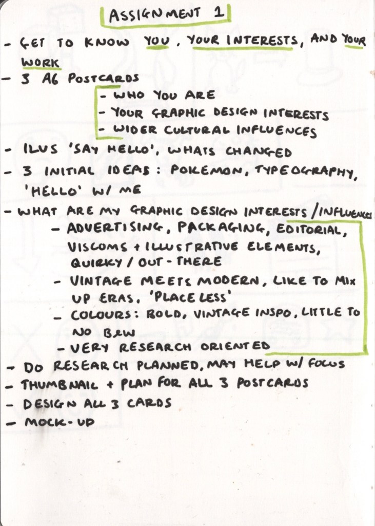 Despite this, I approached the brief as I would any, and began by writing out key points. It was important to me to make sure I was doing it properly and not getting caught up in the ideas I’d had whilst removed from the unit itself. I broke down each postcard into ‘you’, ‘your interests’ and ‘your work’. Each one would showcase my influences and inspiration, and hopefully my design interests too. My three initial ideas were a postcard with a portrait of myself on (you), one focused on the Pokémon franchise (your interests), and one centred around typography (your work). I then started to consider what my graphic design interests and influences are, to ensure I would represent them in my images.