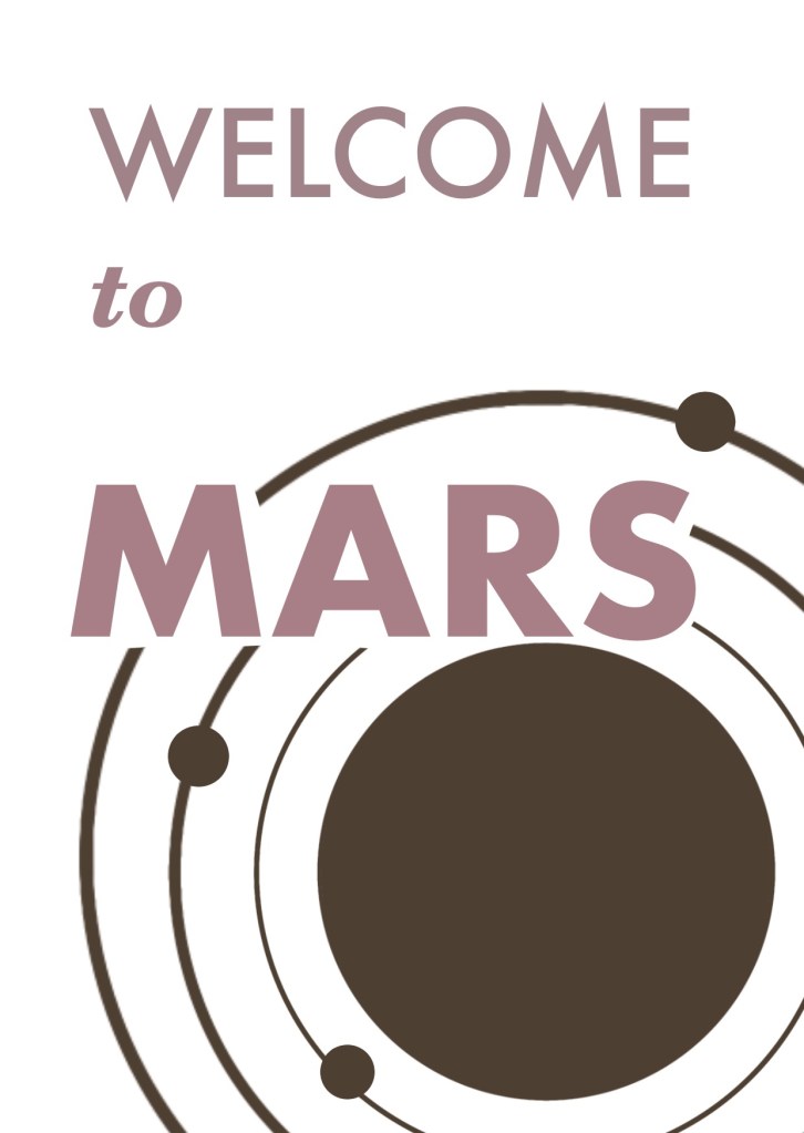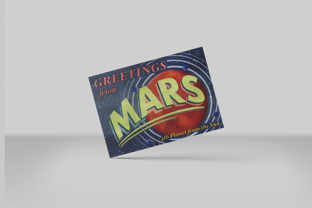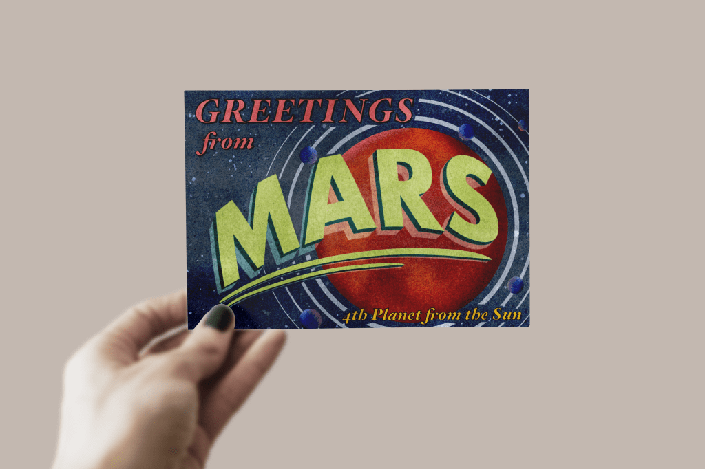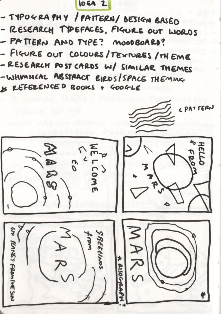 I thought some more about my whimsical space idea and the idea of a ‘postcard from mars’ came to me. I didn’t have any ideas on how this would look, but it felt fun and like a good representation of my style and interests. I played around with some thumbnails, pondered the idea of a risograph-esque style, and worked out an accompanying pattern. I was aiming for some sort of OS map of space with text overlaying it. I decided to create some prototypes for this concept, too, to get a better idea of how the text would interact with other elements.