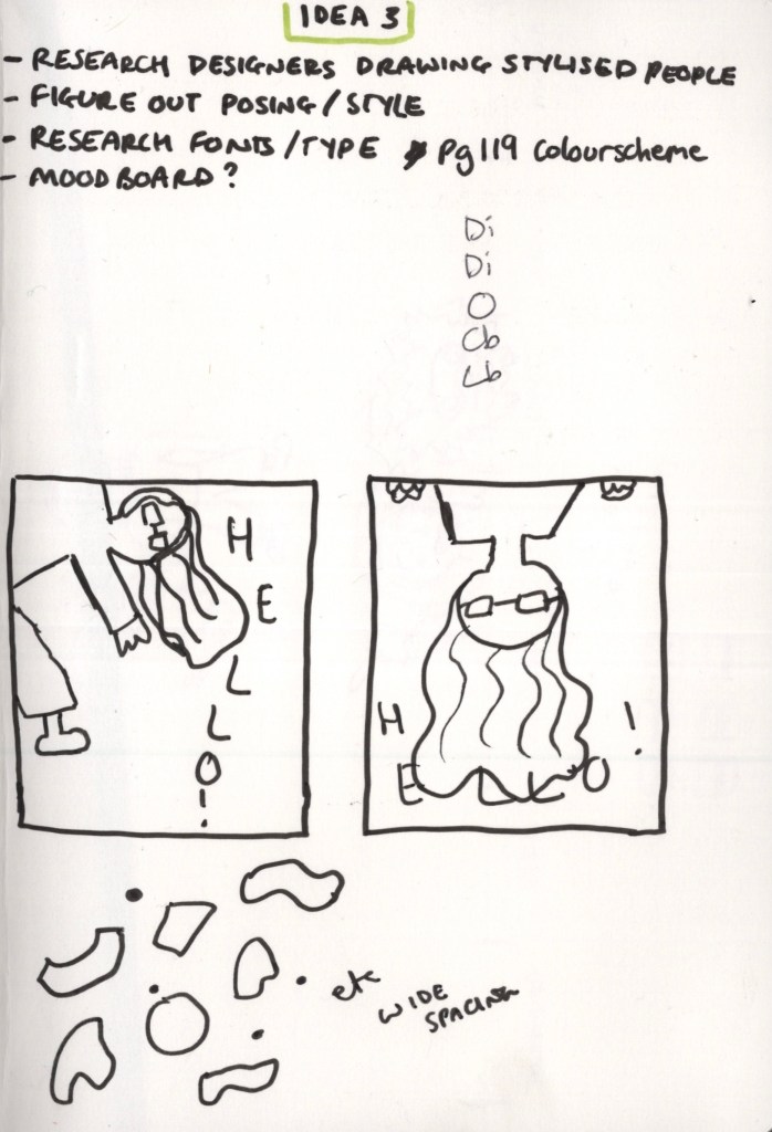 My third postcard concept had been sitting in my mind for many months. It randomly popped into my head as a design and I scribbled it down in my notebook so I couldn’t forget. I wanted a bold, stylised, colourful drawing of myself, peeping around the ‘corner’ of the postcard, saying ‘hello!’. I knew I needed to figure out the exact posing and play around with typefaces and composition, but I was very set on the idea. For good measure, I thumbnailed a second concept, just in case. I also figured out the accompanying pattern for the design – lots of fun and random shapes in the same colour palette picked for the postcard.