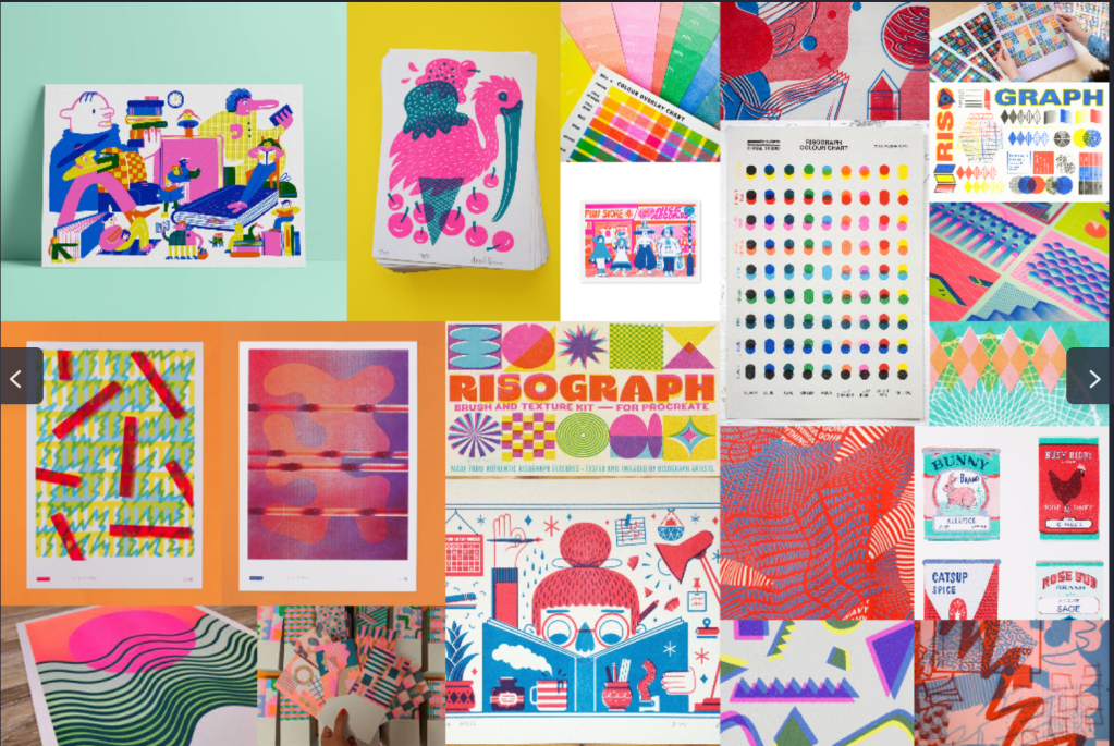 I’ve been pretty interested in risograph prints for some time now. The colours, style, and vintage look of the technique is really appealing to me. I wanted to create something that captured this same feel, as I had noted when trying to work out my design for my second postcard. Given the colour palette I had in mind for my third postcard, I felt I could apply it to this perfectly. I have never designed anything in this way before, nor have I printed anything using risograph techniques, but I’ve spent a lot of time looking at others’ work and felt I could give it a go. I started by collecting some reference imagery so I could ensure I wasn’t going completely off-piste. I managed to find a few colour guides which were helpful too!