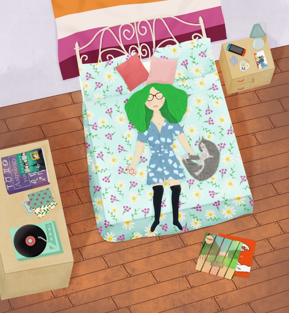 I attended a ‘show your work’ session for Visual Communications students hosted by Emma Powell on the 20th of September, where I showed all three of my designs. When I got to my final design, I showed both background options and explained that I wasn’t sure which to choose as my ‘final final’ design. I felt like the polka dot background was more postcard-y, whereas the waves felt more suitable for a magazine cover or spread. There was some really interesting discussion around how each background impacted the piece. It was noted that the text stands out clearer and that your eyes are drawn down to it in the waves background, but that the polka dot background complements the dots on my cheeks and dress very well.