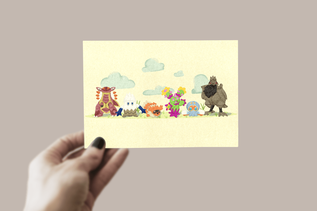 For this project, I am using Bardot Brush’s ‘Magic Paper’ on my postcards. These are texture overlays that give the appearance of paper or traditional mediums whilst designing digitally. I love how they interact with my work and have become a huge fan of them. For the Pokémon postcard, I used the ‘Cork Board’ overlay. I had to turn the layers off regularly in order to ensure I was picking the right colours, as they impact how they look. I chose the alternate ‘shiny’ colouration for all 6 Pokémon, as I am a shiny hunter and this relates most to my hobbies.