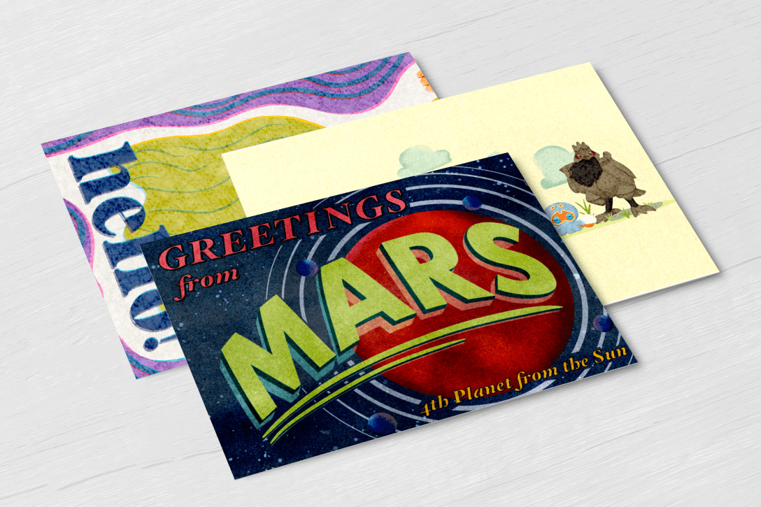During the workshop, I was asked about the backs of the postcards and what I was going to do with them. I realised I hadn’t actually considered this much at all – beyond maybe using the patterns I had designed at the start. I didn’t have enough time left to fully explore this concept, but it did get me thinking about how I could add motifs to the backs of the postcards to connect the designs on the front. I considered adding a ‘shiny charm’ – an item used in Pokémon games that increases your chances of obtaining shiny Pokémon – and some clouds to the back of the Pokémon card. I could add more wave decals to the back of the ‘hello!’ piece, and a planet or two along with more solar system lines on the back of the ‘Greetings from Mars’ card. I would like to come back and explore these options further and see how I could create a more ‘complete’ piece ready for printing.