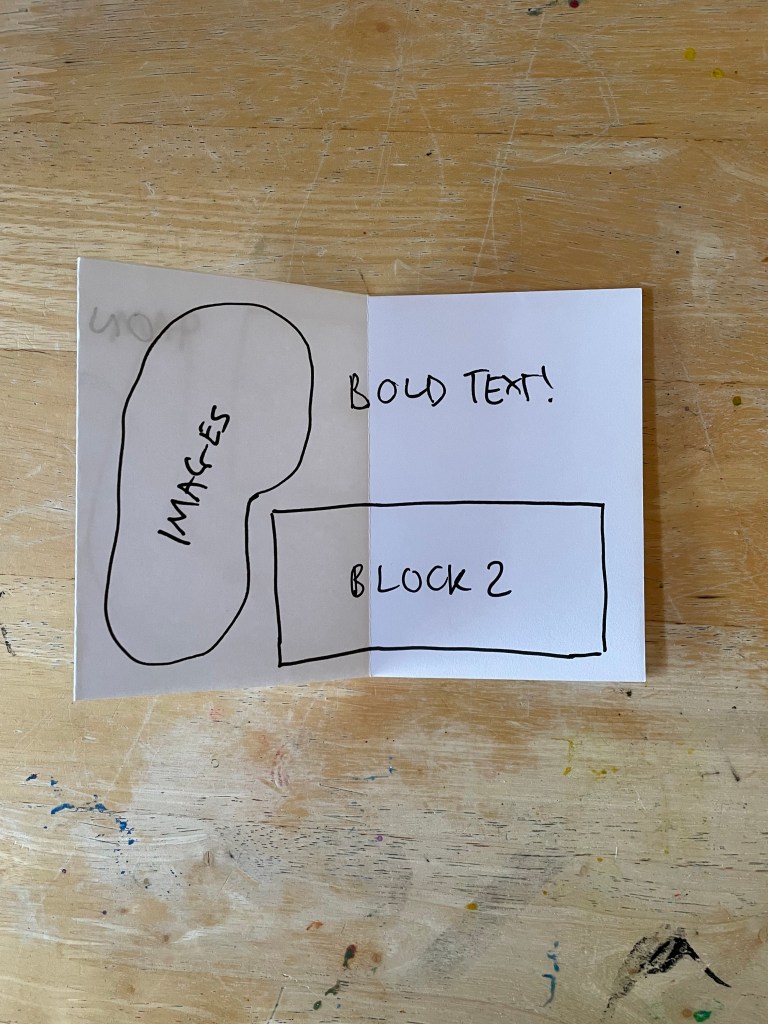The exercise says to not think too much about the content of the leaflet – but it does specify what is expected to be included. The organisation has provided a title, four 120-word chunks of text, and has requested that their contact details and address are also featured on the leaflet in an easy-to-find way. I was asked to work with an A4 piece of paper for this, so I grabbed a stack of printer paper to play around with.