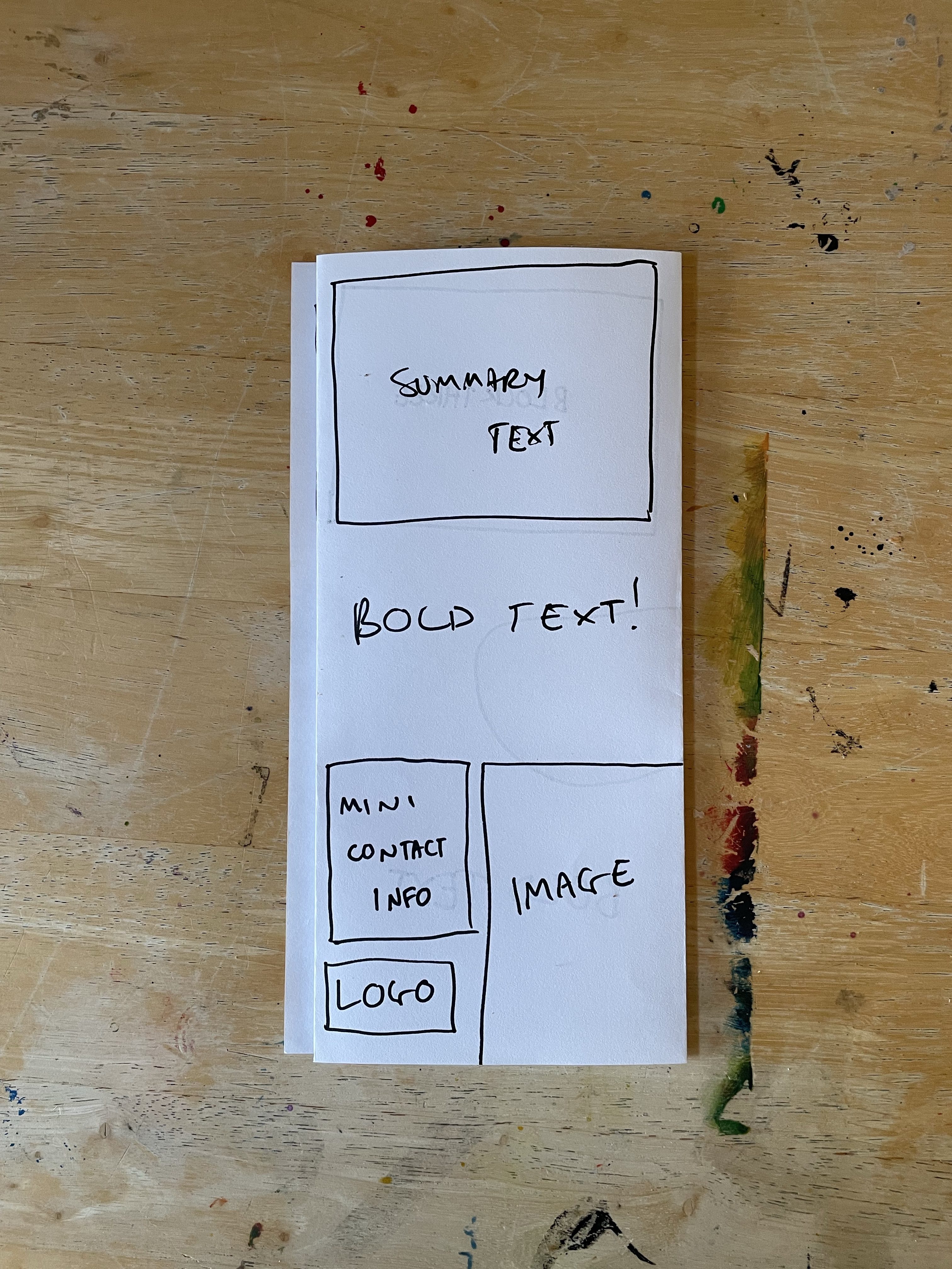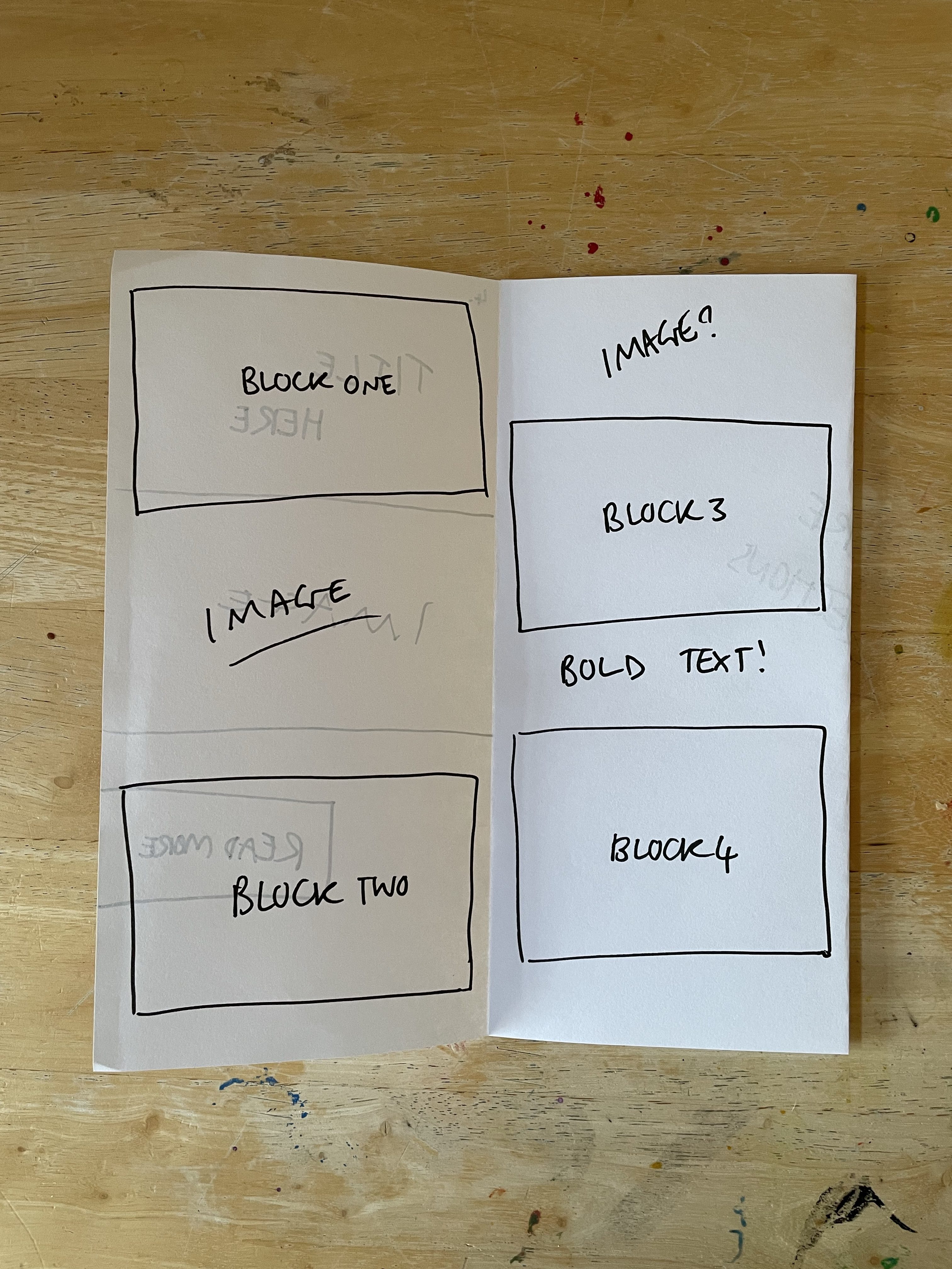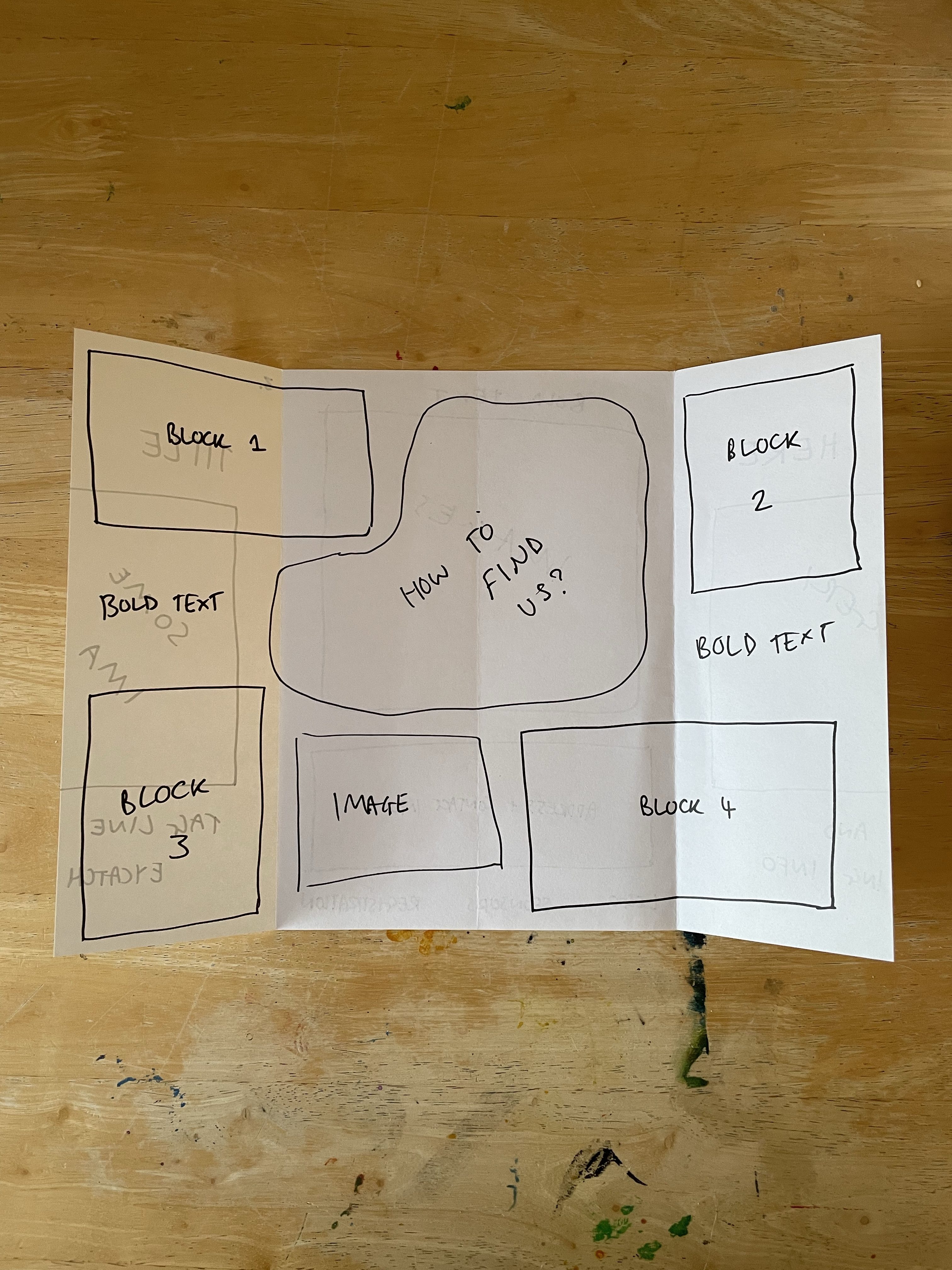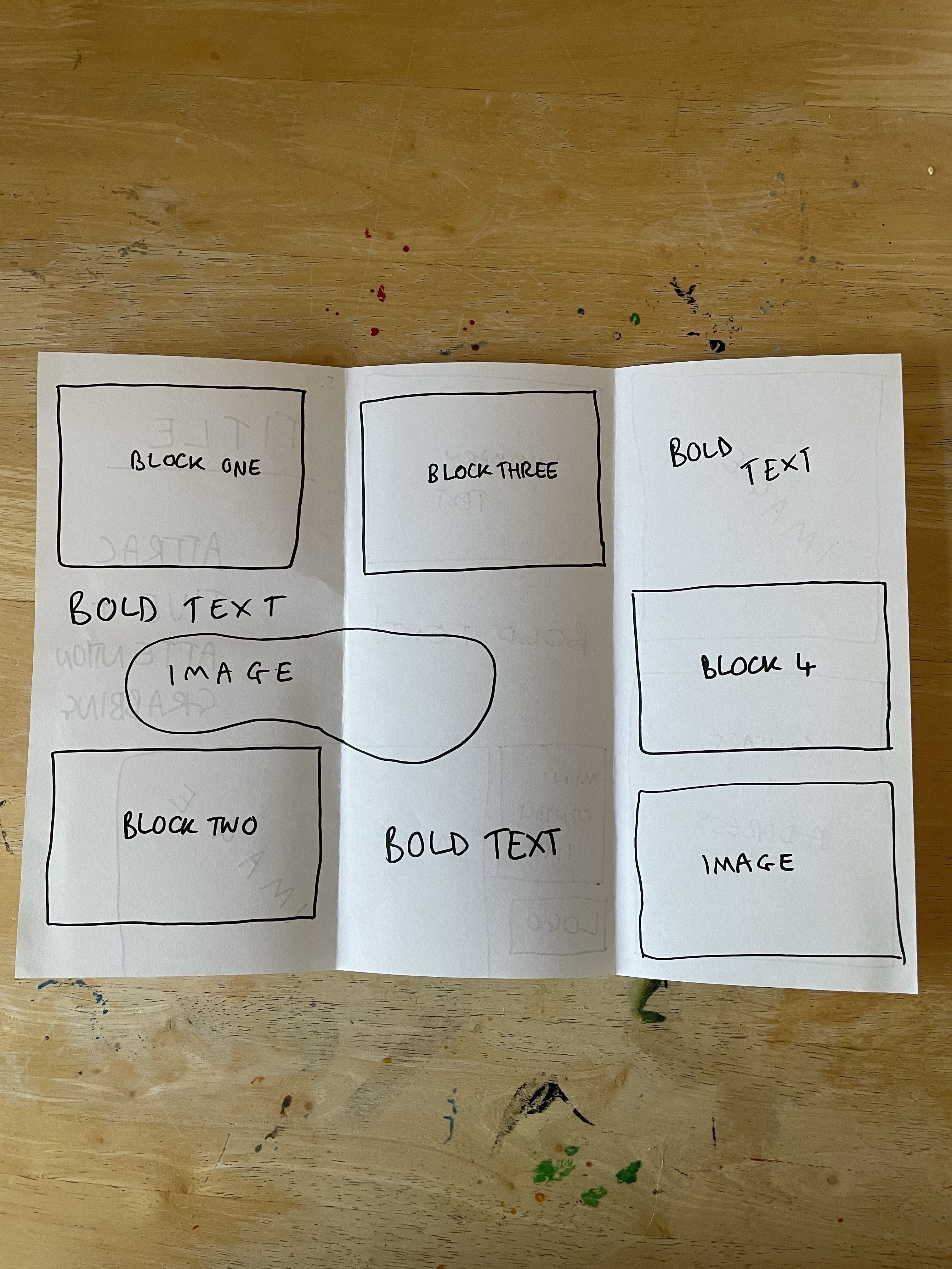 So I decided to start by folding the paper in as many ways as I could think of off the top of my head with no research or experimenting. Just, here are some folds I know for leaflets from my experiences. This gave me five mock-ups to work with. I went through each one and blocked out where I felt content would be best going based on each fold. Then I assessed each one and whether I felt they worked, and how they could be better.