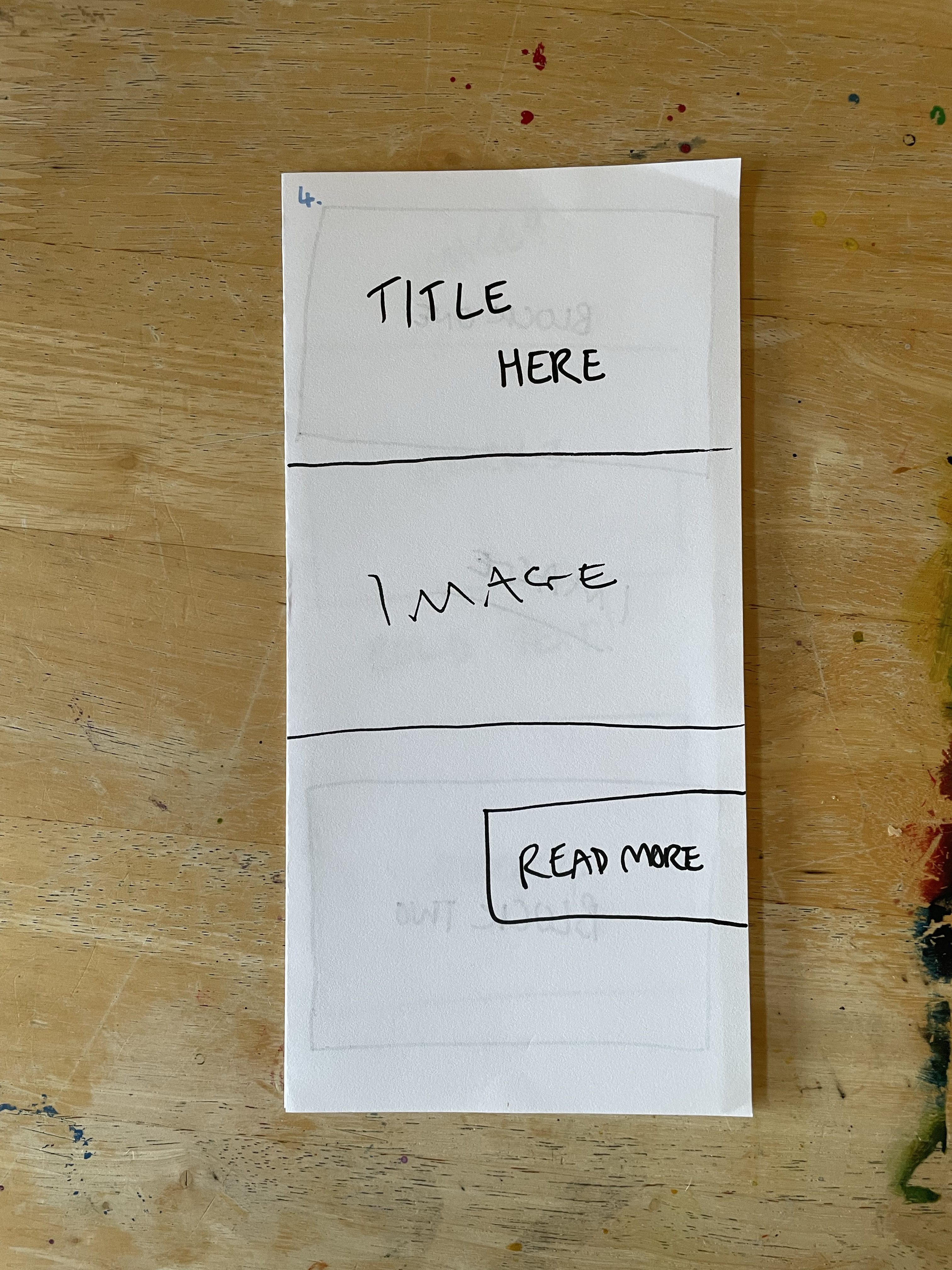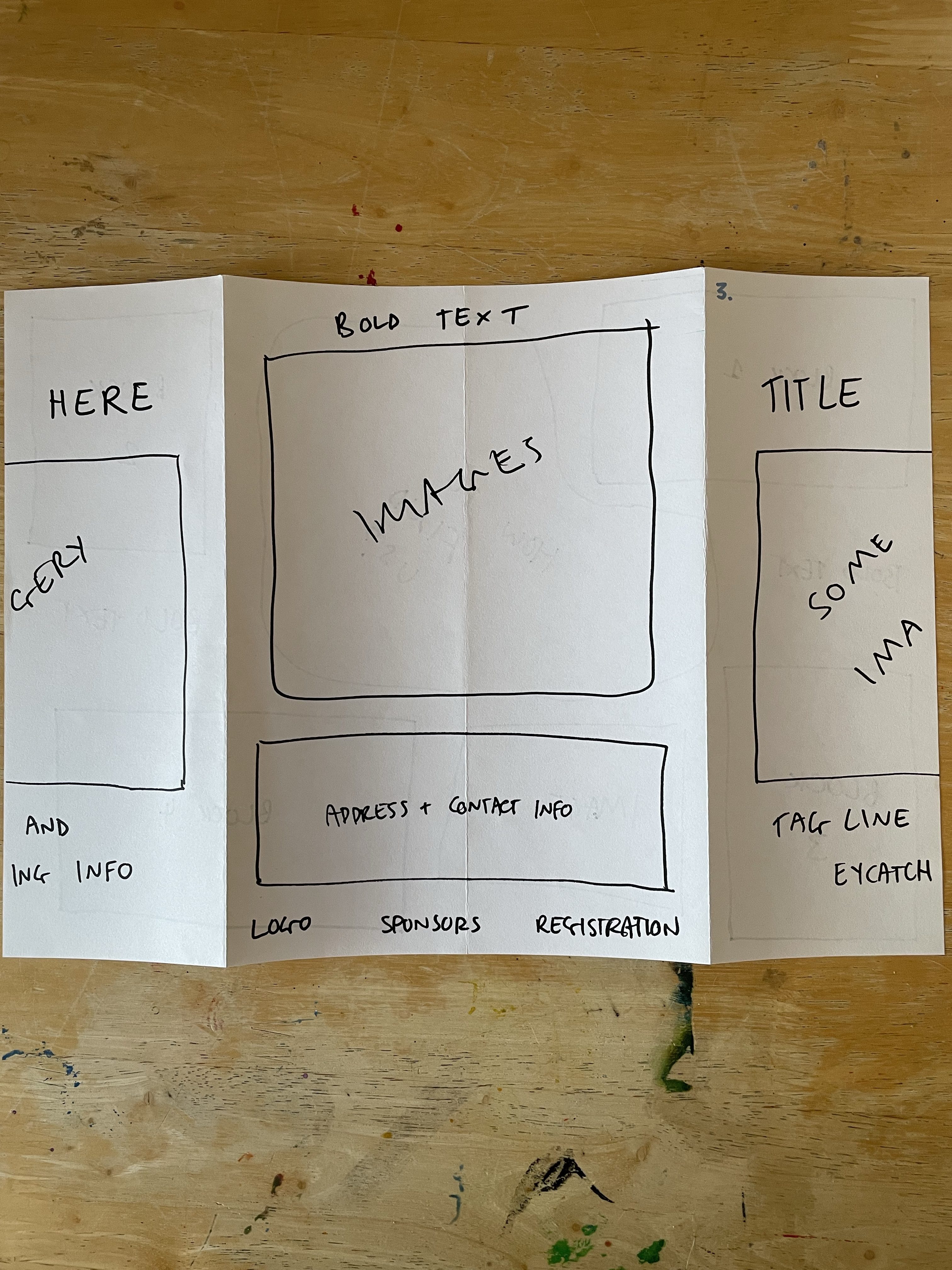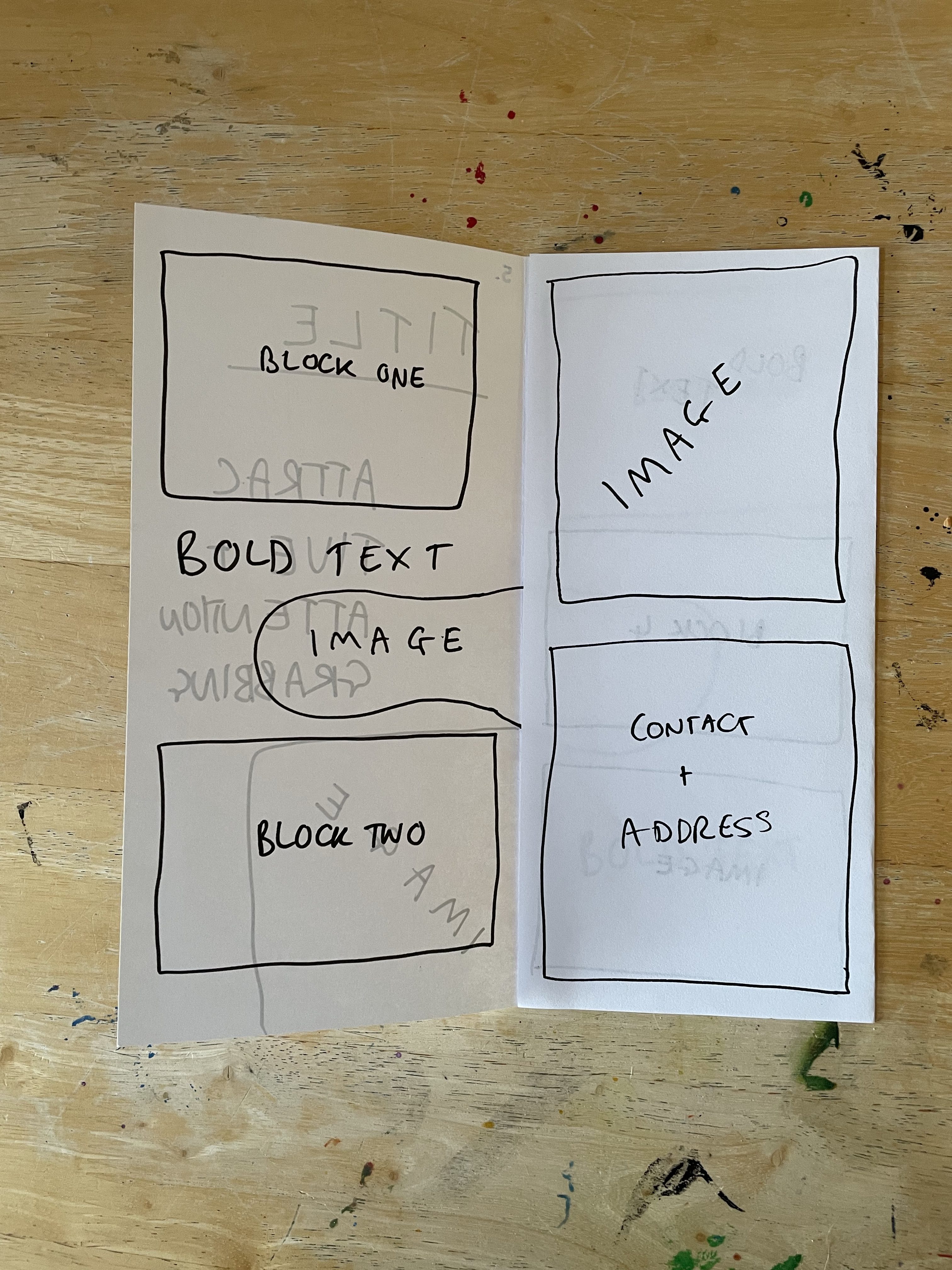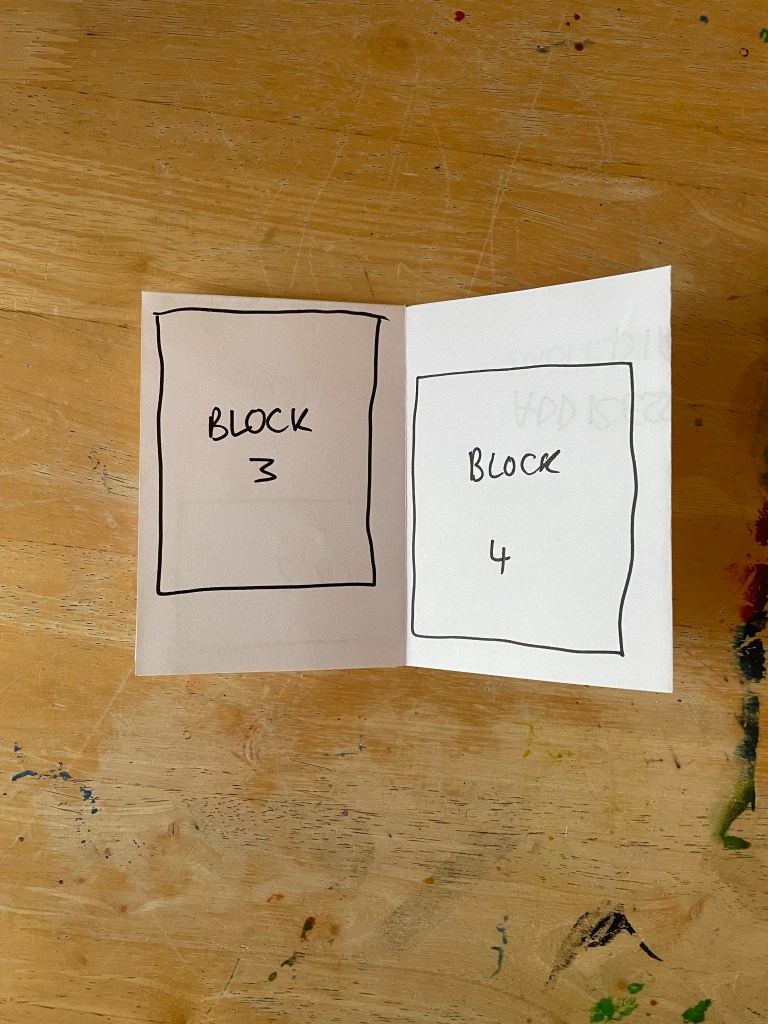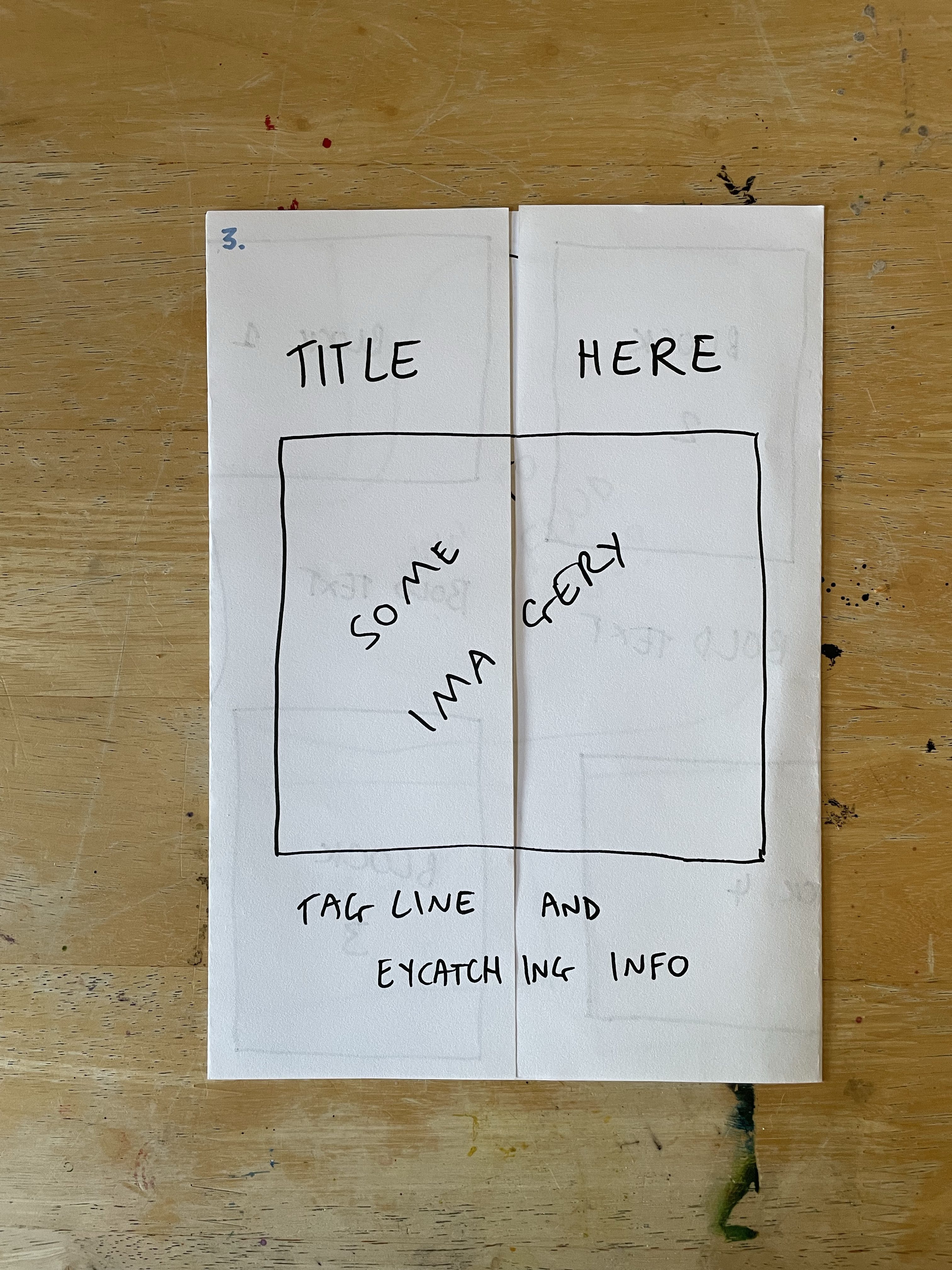 So I decided to start by folding the paper in as many ways as I could think of off the top of my head with no research or experimenting. Just, here are some folds I know for leaflets from my experiences. This gave me five mock-ups to work with. I went through each one and blocked out where I felt content would be best going based on each fold. Then I assessed each one and whether I felt they worked, and how they could be better.