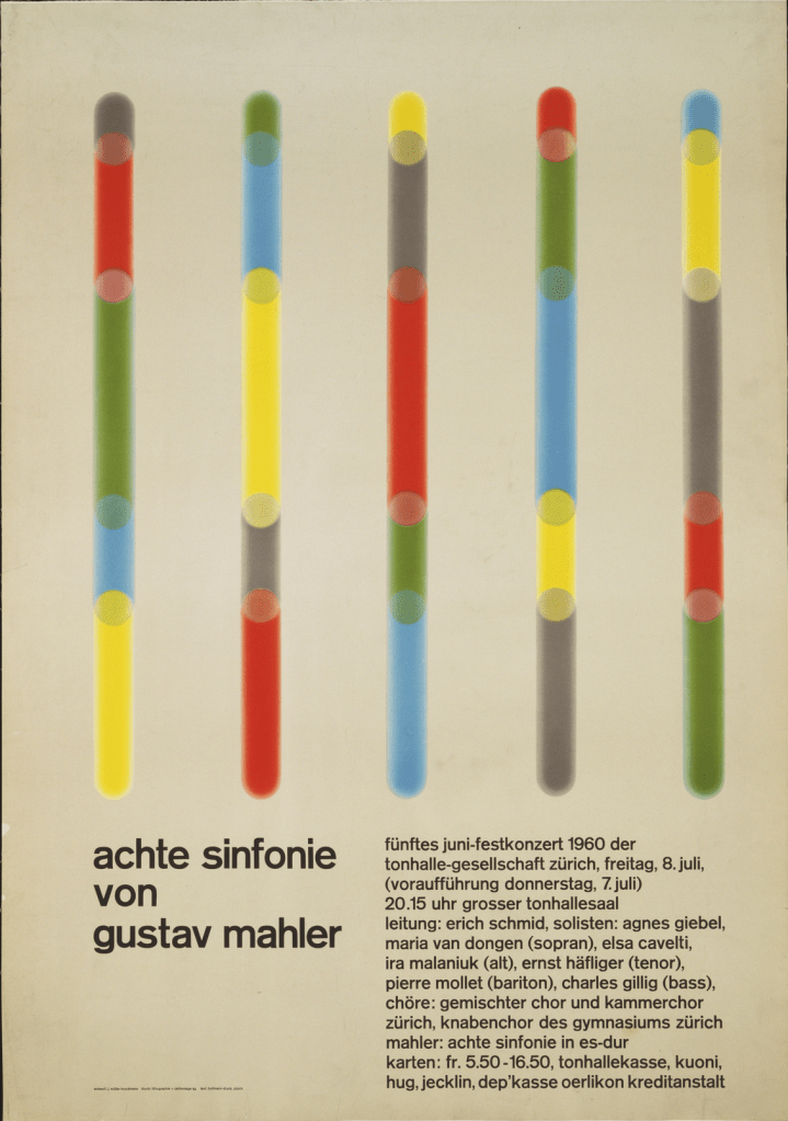 Muller-Brockmann’s usage of visual language, like Rand’s, is minimalistic and simple. Rand was likely inspired directly by Muller-Brockmann, so this makes sense. Muller-Brockmann’s work is less playful, however, and feels very clean. The usage of colour is limited and very intentional, and the combination is visually gorgeous. Colours are still bold and follow a primary palette, which seems to be a key factor in Swiss design work.
