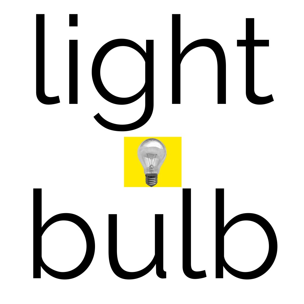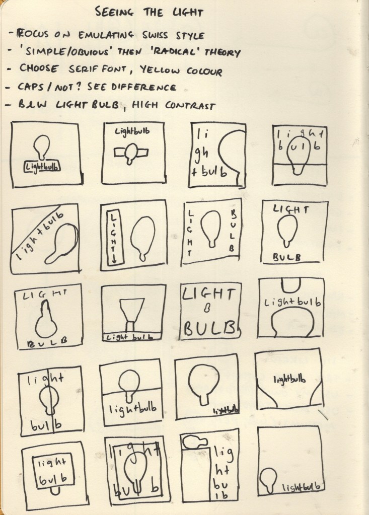 I’m personally not a huge fan of Helvetica. It just doesn’t sit well with me in the same way other fonts do. I added the text ‘light bulb’ to my canvas in Helvetica, anyway, and pondered what other sans-serif fonts I had that gave a Swiss style vibe. I duplicated the text and tried a handful of fonts before settling on a modern sans-serif font – Raleway. I was actually introduced to this font by a fellow OCA student who used it in their design guide for the OCA Student Association, and I’ve become very fond of it.
