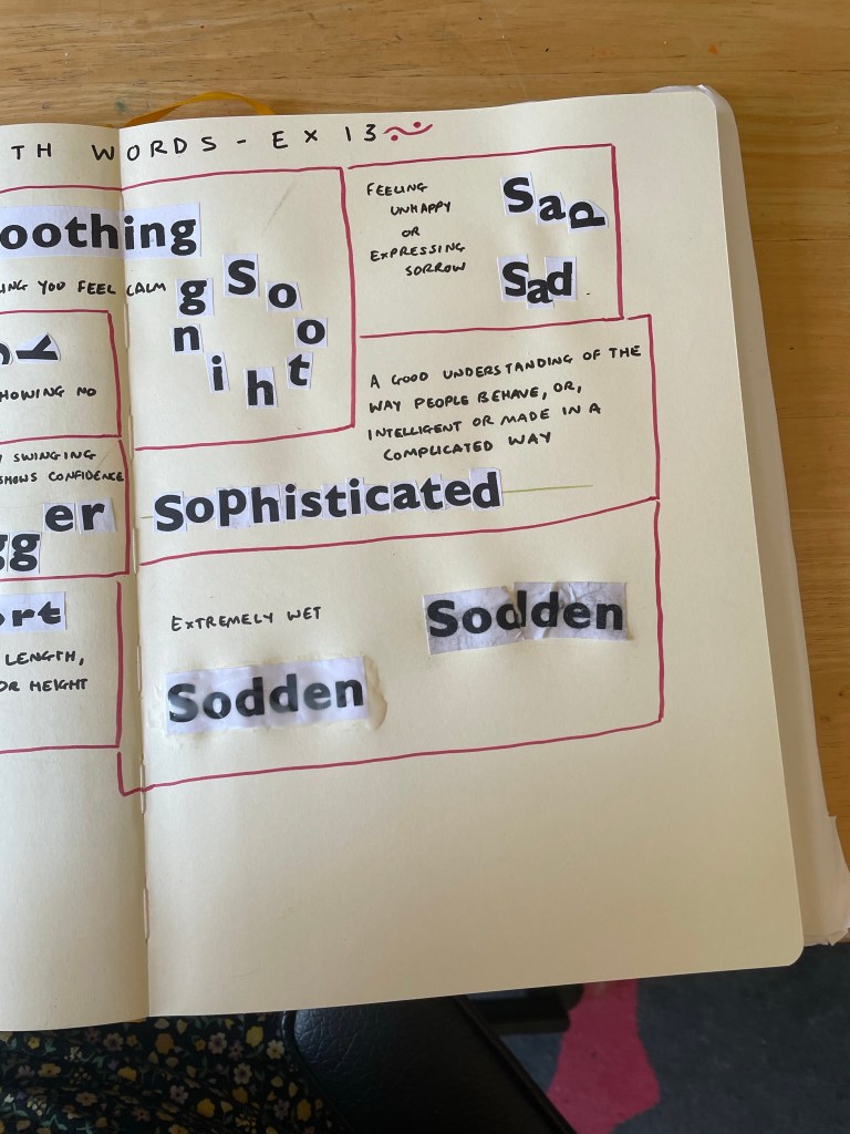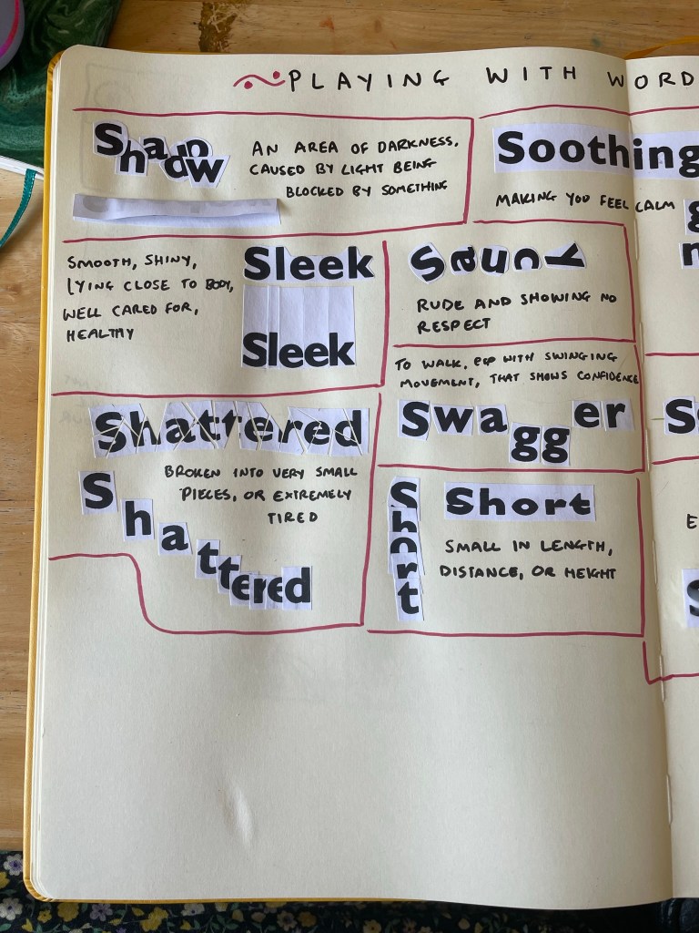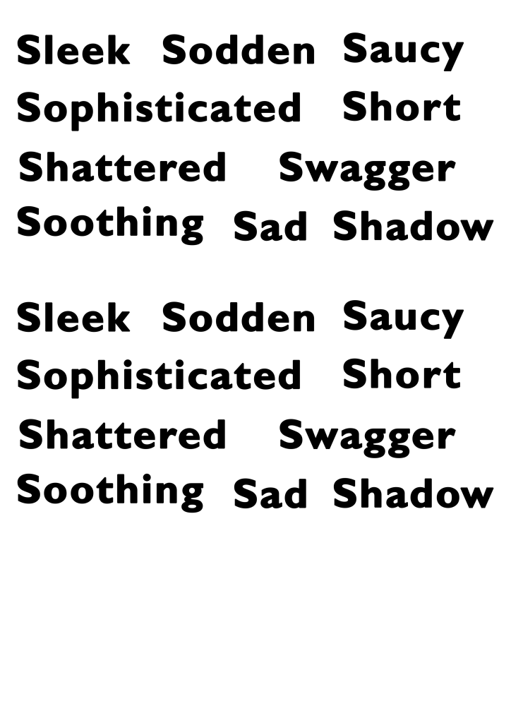 I began with shadow – overlapping each letter to block light from the others. It’s not quite a shadow, but I think it demonstrates the meaning of the word well. I then folded over the paper and stuck half of it down, so that the word itself creates a shadow. I really like this approach. Next, I moved on to sleek, which was tricky to work with in this format! I tried cutting the paper in a very smooth and rounded way, close to each letter, as the definition says, but it didn’t feel like it was emphasising the word. I then cut out each letter individually, very close to each letter, and leaving a lot of height above. I then stuck each piece very close to each other. I think this is much more effective.