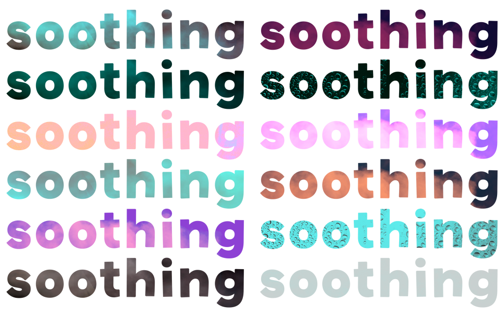 Short feels self-explanatory, and I really enjoy how it looks. I think I prefer the one cut horizontally to the vertical stacking, but I think this is likely due to the white bits on the paper blocking the letters. When I was trying to think of what to do for soothing, I struggled a bit. The definition was a bit abstract and simple. I began by just pasting the whole word in because looking at Gill Sans makes me feel calm. The font and word itself are soothing. I then arranged each letter into a circle, as this felt like another representation of something calming.