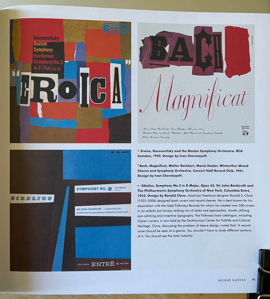 I chose to use Mid-Century Modern Graphic Design by Theo Inglis. This book is a collection of book covers, record sleeves, posters, magazine covers, and illustrated books from around the mid-century period. It’s one of my favourites to reference when working as I find it really inspiring. I opened it to a random page and took note of my initial responses – my eyes were immediately drawn to the top left design, a record cover for Eroica, especially the word itself. The bold, upper-case text is extremely eye-catching. The white background and newspaper-clipping effect highlights this too. My eyes were then led to the red areas of the design, which made me aware of the rest of the text, and the logo in the top right corner. The usage of colour and font choice is clever!