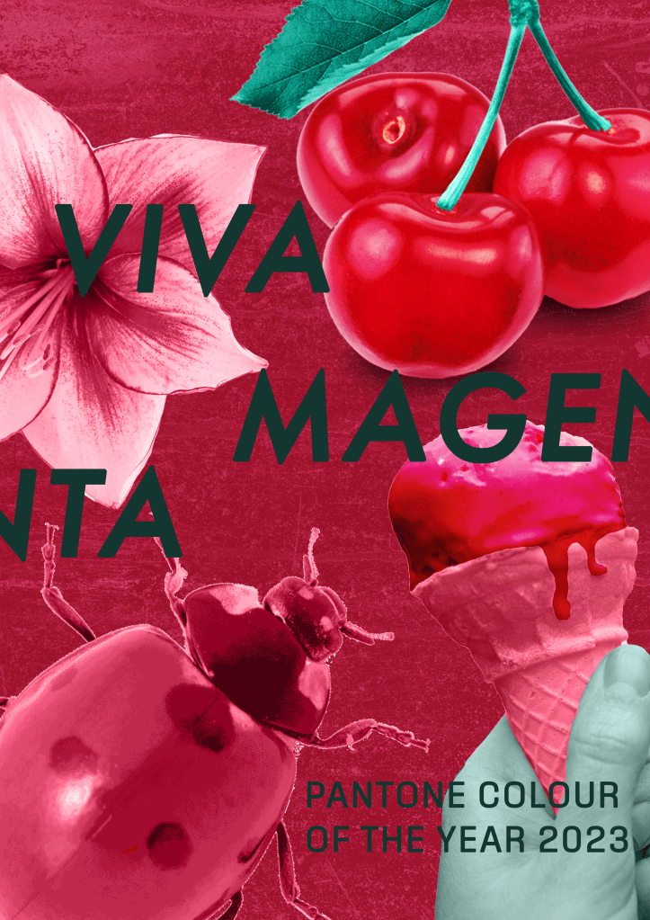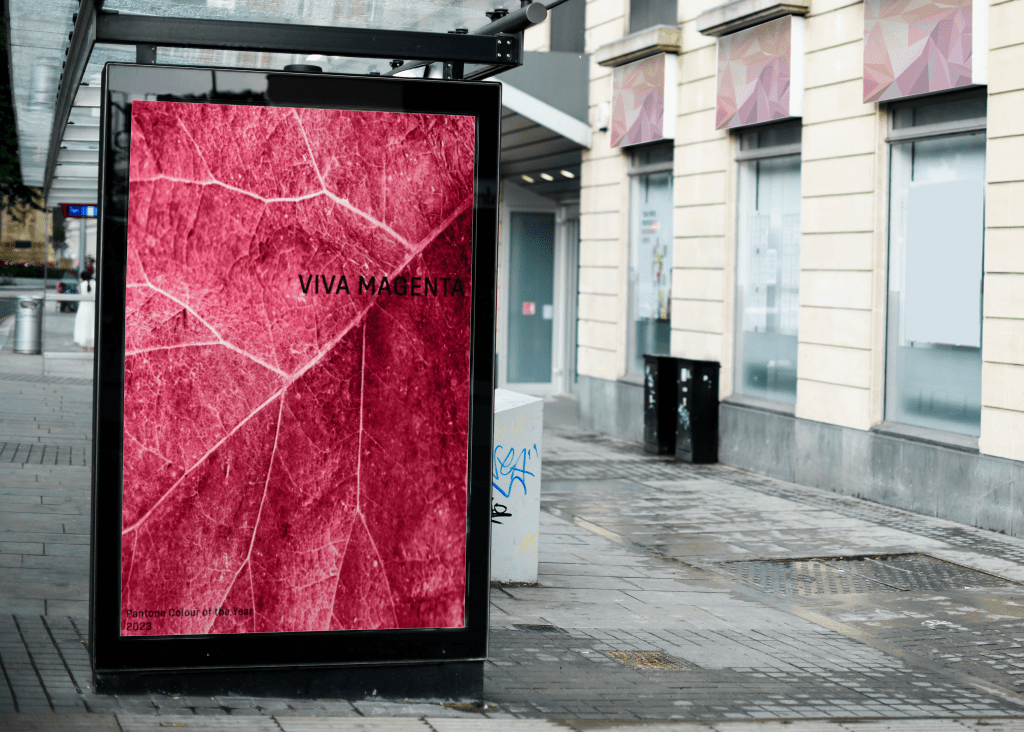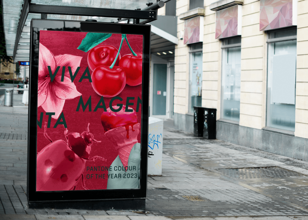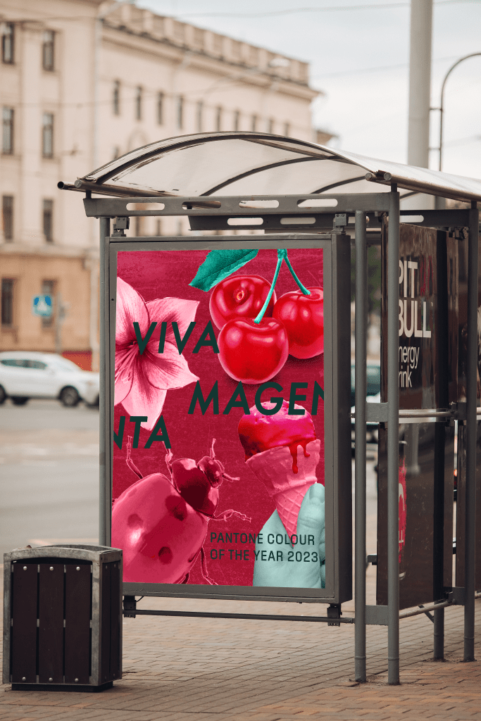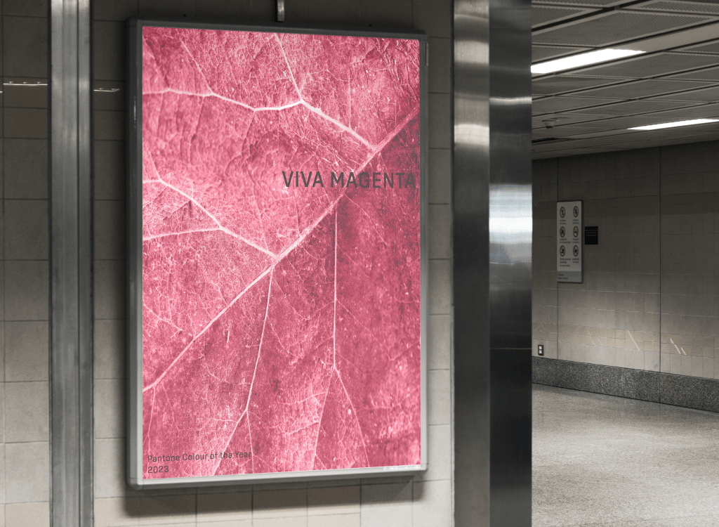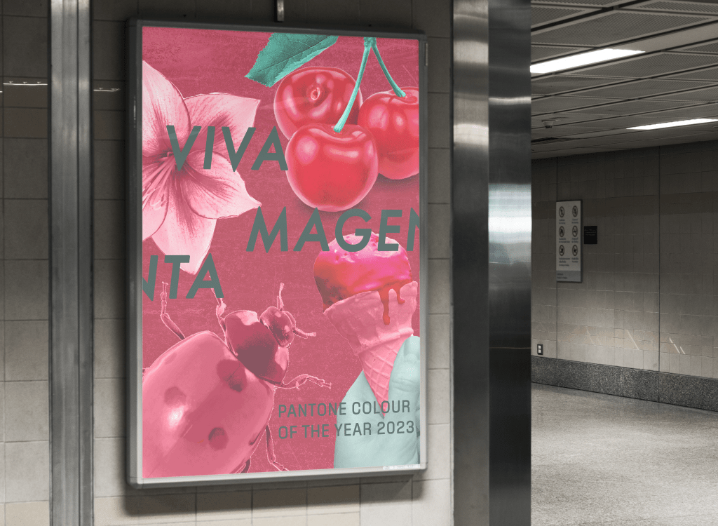 Advertising and marketing are where my passion lies. I love creating things that draw a passerby in. In my head, this was a poster for public transport, walked past on the daily commute, eye-catching in a way that makes you curious to find out what that is. I wanted people to be googling ‘viva magenta colour of the year 2023 pantone’, even if they weren’t going to visit the exhibition itself.