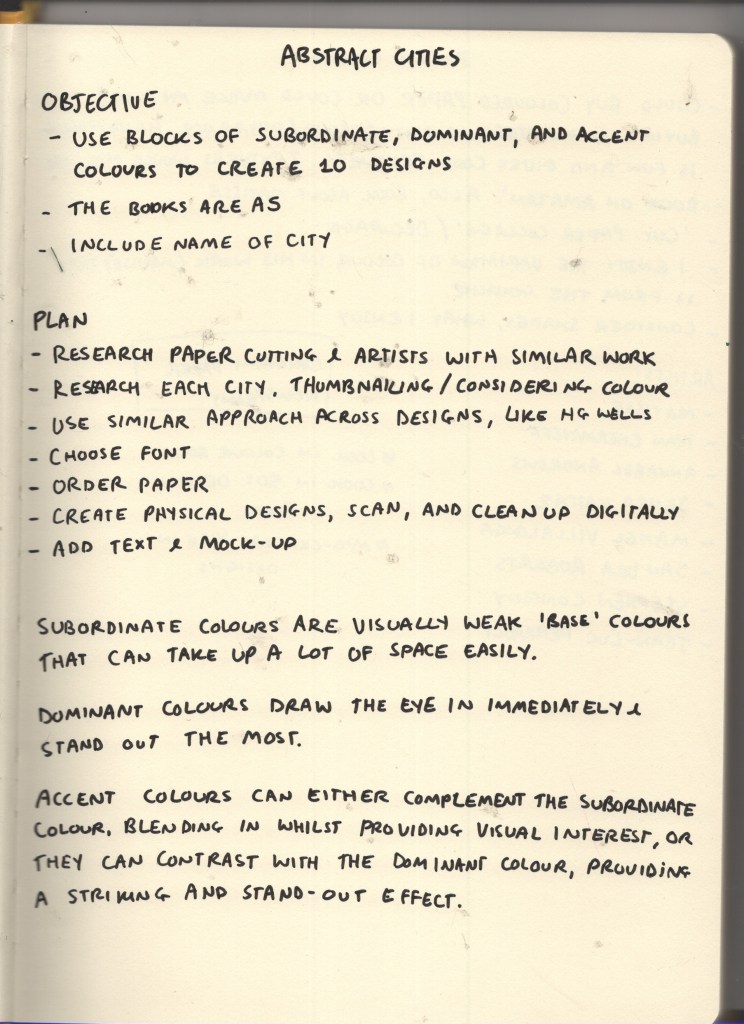 This exercise asked me to create 10 abstract designs to be used as book covers for travel guides. I was provided with 10 cities to design for and was asked to use blocks of subordinate, dominant, and accent colours. The books were to be printed in A5 landscape format, and the covers had to feature the name of the city alongside or incorporated into the design.