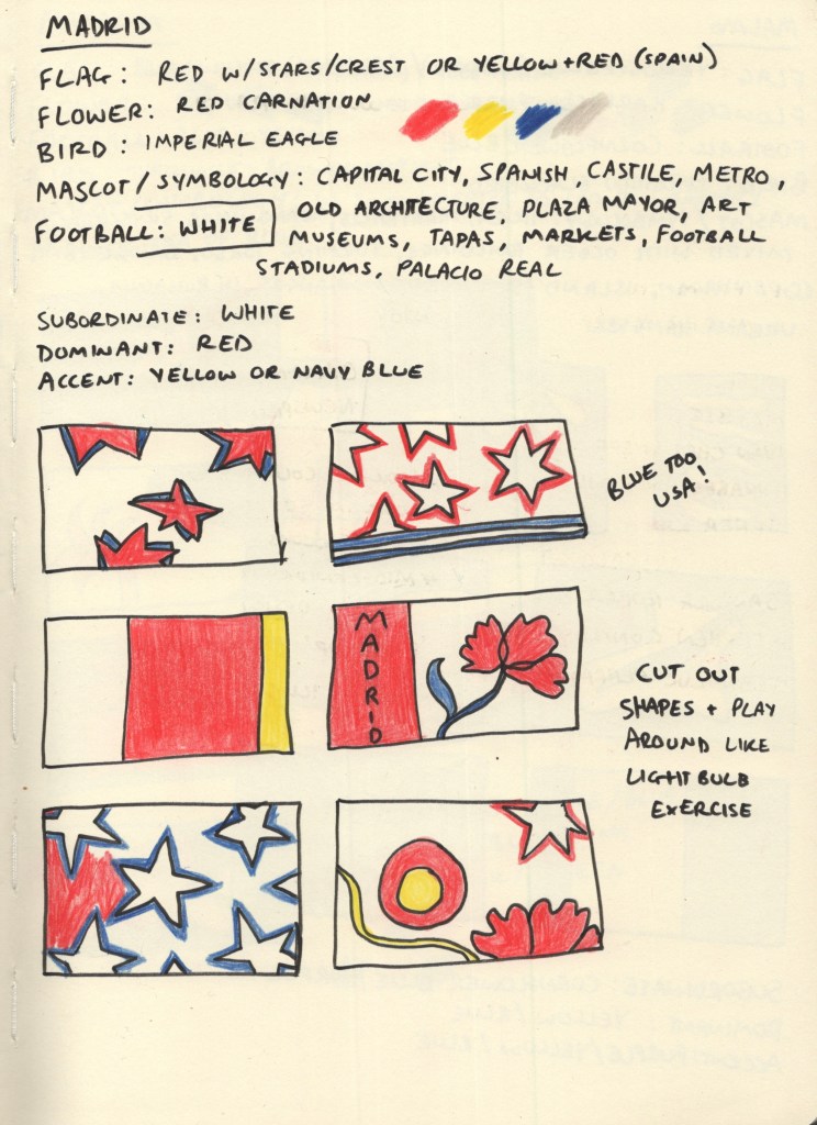 Madrid has its own flag, red with seven white stars, and the Spanish national flag is red with a yellow stripe through the middle. Its football team play in white, and the national flower is a red carnation. The national bird, the imperial eagle, has bright yellow feet and accents around its nose. I built a colour palette from this: red, yellow, and white being obvious choices. I added a dark/navy blue to the mix as I felt it complemented the existing palette nicely. I then began exploring thumbnails using coloured pencils.