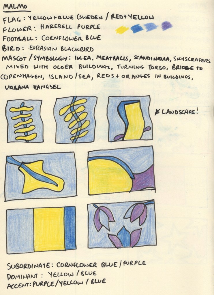 Malmo does have a flag, but I had to dig for it. The Swedish flag is very well known and it’s the colour scheme used for Swedish brands such as Ikea for this very reason. Malmo’s football team play in a cornflower blue, which I felt complemented the Swedish flag colours perfectly. The national flower, the Harebell, is a purple shade similar in saturation to cornflower blue, so I noted it down in case I wanted to add it to the piece somewhere.