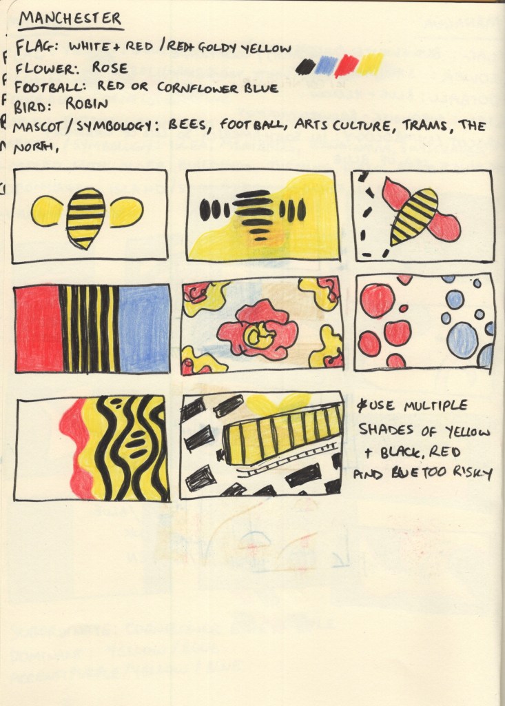Still, I went through the same research process as with the other cities and explored colour options. It was tough, as I’m very familiar with the rivalry between both football teams and wanted to avoid favouring either in my colour choices, but I wasn’t really sure where else to get colours from. The English flag doesn’t really scream Manchester specifically, and the red in that context just makes me think of Manchester United.
