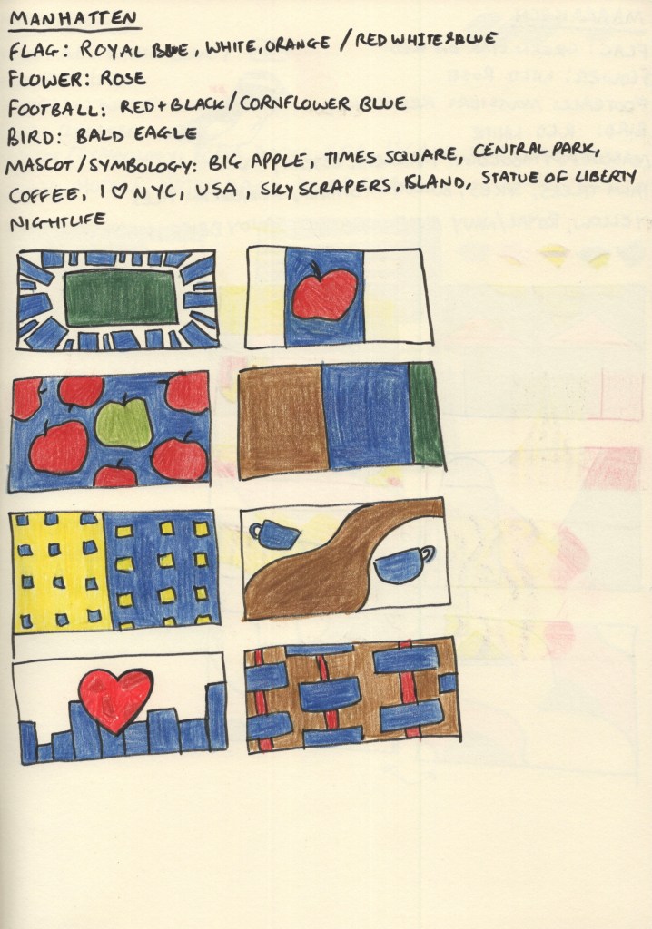 My colour-choosing process for this destination was similar to Managua. Manhattan has its own flag featuring horizontal blue, white, and orange stripes – though it’s not particularly well known. Football – or soccer as it’s known over there – is not particularly popular in the USA either, and there wasn’t a clear Manhattan football team. The red, white, and blue of the USA flag are iconic, so I noted them down as options, but the iconography that comes to mind when I think of Manhattan and the wider New York City area influenced my colour choices a lot more.