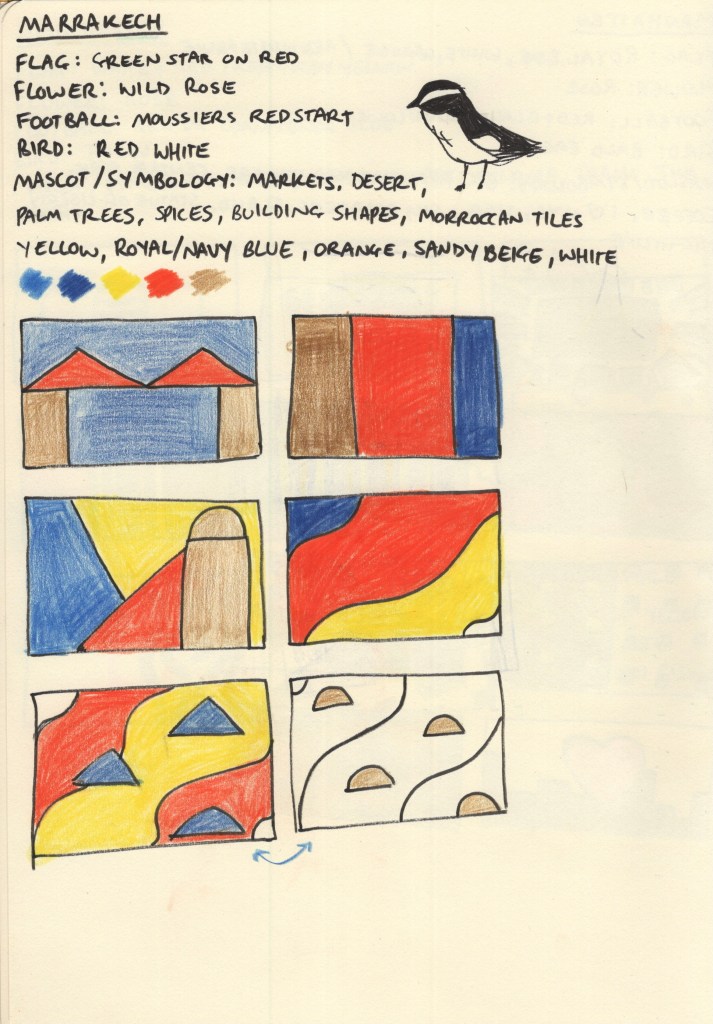 Choosing a colour palette for this city was very easy, Marrakech screams oranges, yellows, and blues from the second you imagine it! The Moroccan flag – a green star on red background – didn’t really have associations for me with the city itself, and the national flower, bird, and local football teams didn’t fit either. Though I thought the bird – moussier’s redstart – had a really cool colour distribution in its feathers and thought maybe I could do something inspired by that.