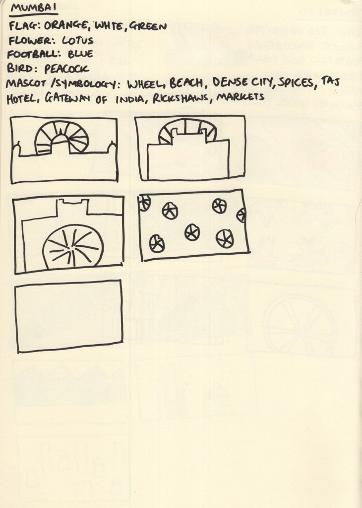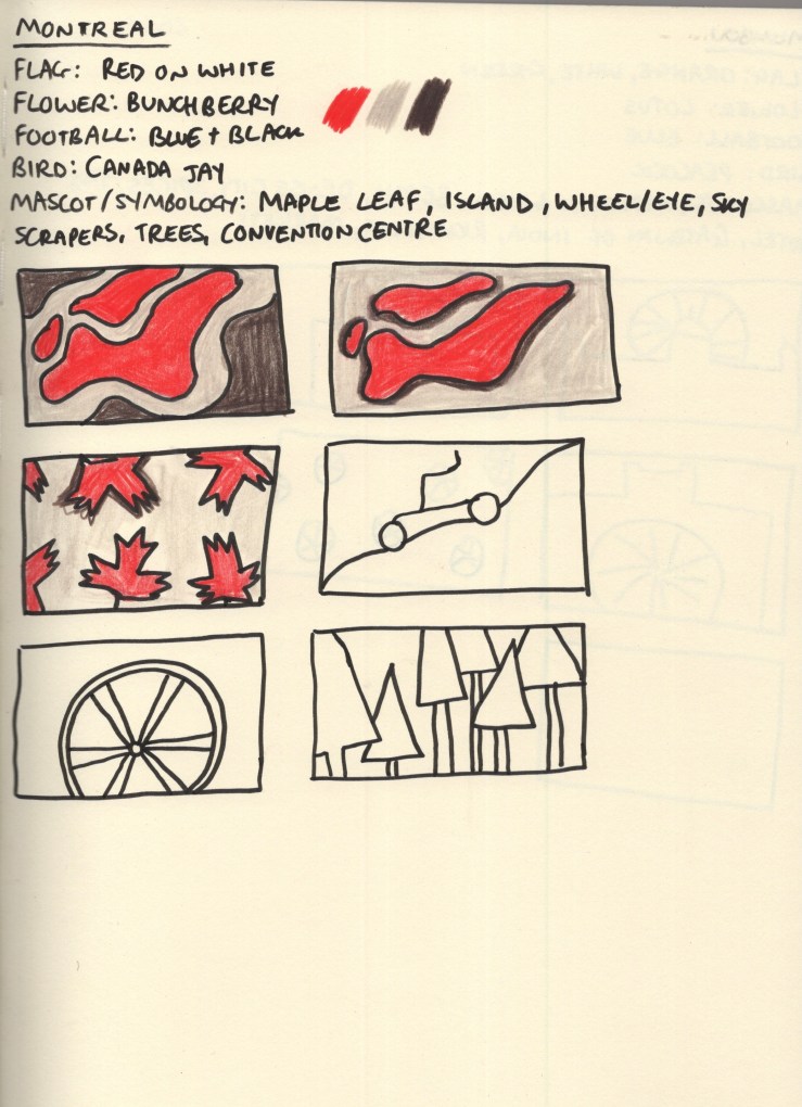 For each city, I started with 5 research points: the flag of the city or country if there wasn’t one, the national flower and bird, the local football team, and any famous mascots or symbology connected to the city. I chose these as I felt they’d give me a variety of colours and shapes to draw from during my thumbnailing process. I wanted to create as much visual interest as possible, whilst ensuring the colours I used were simplistic and recognisable for the city.