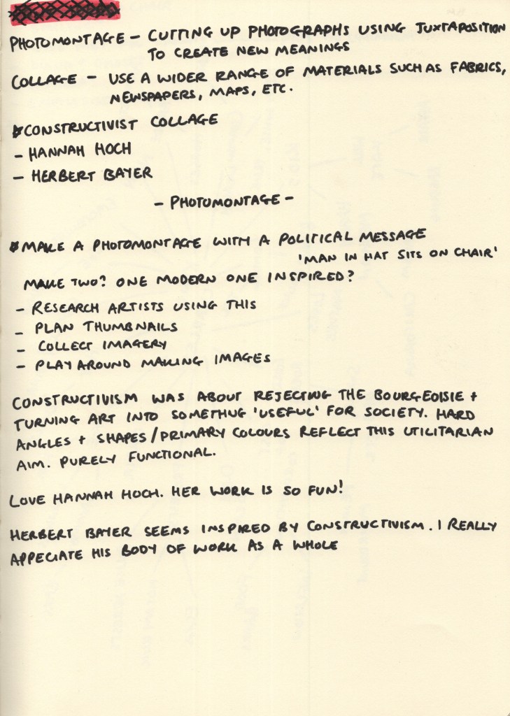 To start, I dissected the brief and considered some points to research. I’ve been introduced to several collage artists throughout my degree who have inspired me, and I especially enjoy the constructivist era collages. I revisited the work of Hannah Hoch, as well as Herbert Bayer, and considered what sort of collage I wanted to create.