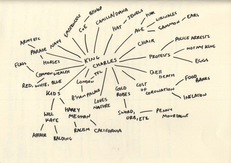 I didn’t think too hard about what political event to explore, and off the back of the King’s Coronation a week before, I was pretty inspired by the possibilities it could hold. I was especially inspired by the Private Eye cover for that week, which simply said ‘Man in hat sits on chair’. It felt like a wonderful way to use both text and visual dynamics to achieve a humourous outcome.