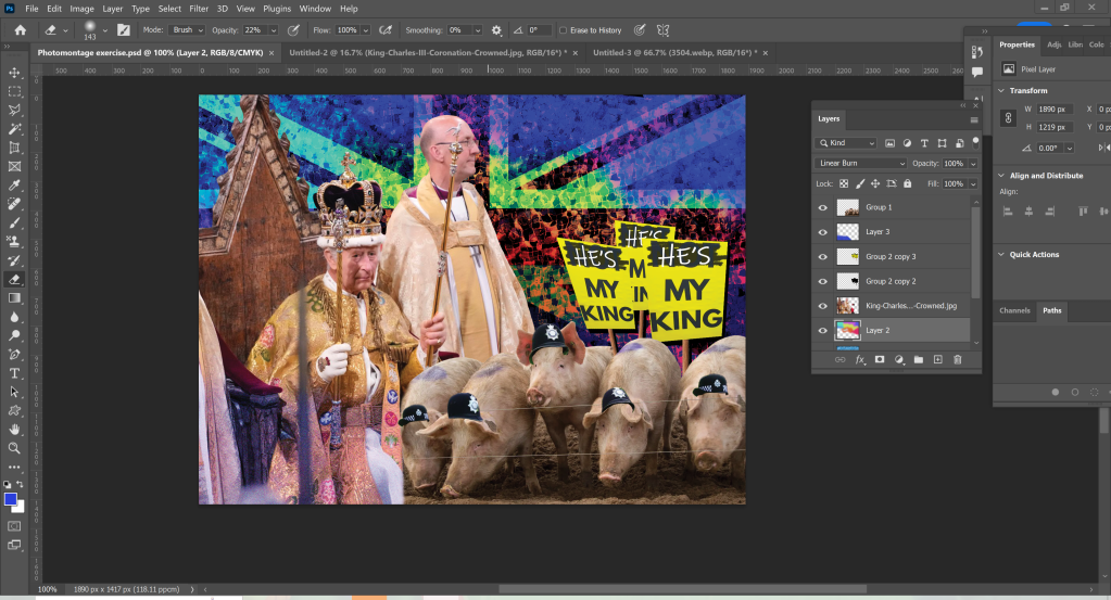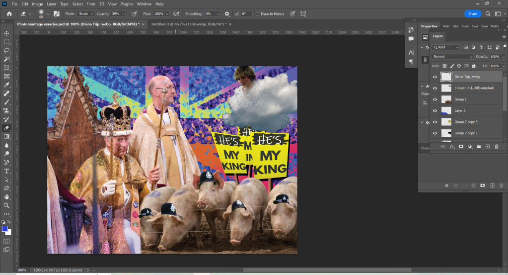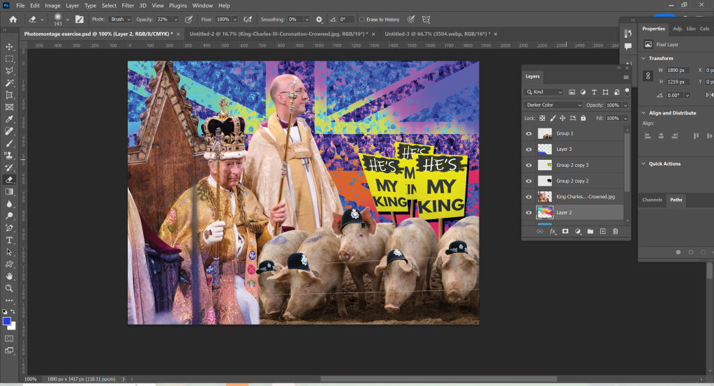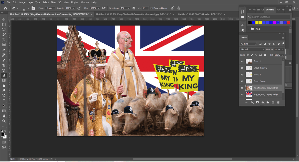 I started by adding a picture of the King on his throne, with some pigs wearing metropolitan police hats. I then edited the ‘Not My King’ placards that were confiscated by the police on the day of the coronation to say ‘He’s My King’, and arranged them in the background. I threw a Union Jack in as a backdrop, just to fill the space and see what it looked like.