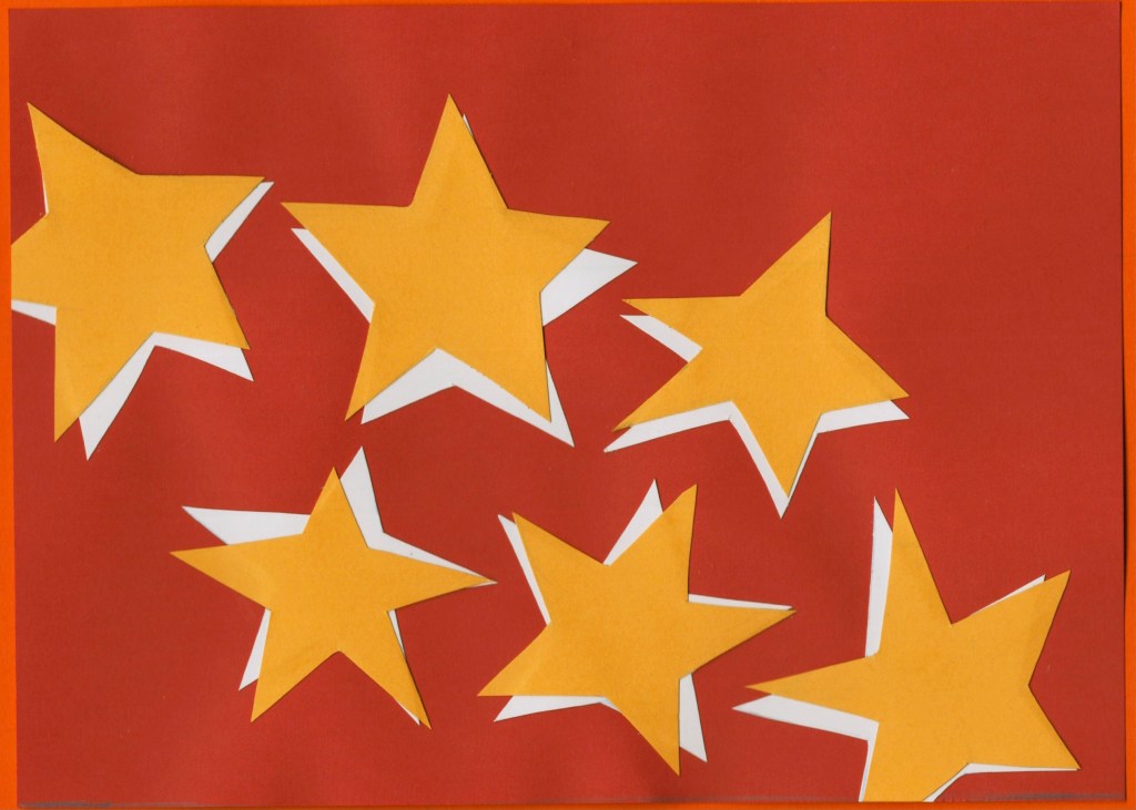 For the design, I cut out 6 stars, not trying hard to have them be even or equal, but also ensuring they were readable as stars. I then traced the stars onto white paper and cut out another 6. I placed the white stars on a red piece of paper cut to A5 size and then overlaid them with yellow stars. I wanted them to look disjointed and rough, not like a smooth and consistent drop shadow. This was actually one of the final pieces I worked on and I, unfortunately, forgot to add a 7th star, which I regret now. I think it’s a strong design, and I’m happy with it, but it would make more sense with a 7th!
